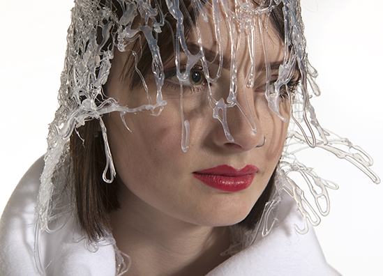 J'ai confectionné cette création en simili-cuir, tissu imperméable que je doublé avec un tissu en polyester; entre ces deux matières il y a de la ouatine pour donner du volume et de la chaleur. Sur sa tête, elle porte une coiffe en silicone, cela rappelle le froid glacial des pays nordique...